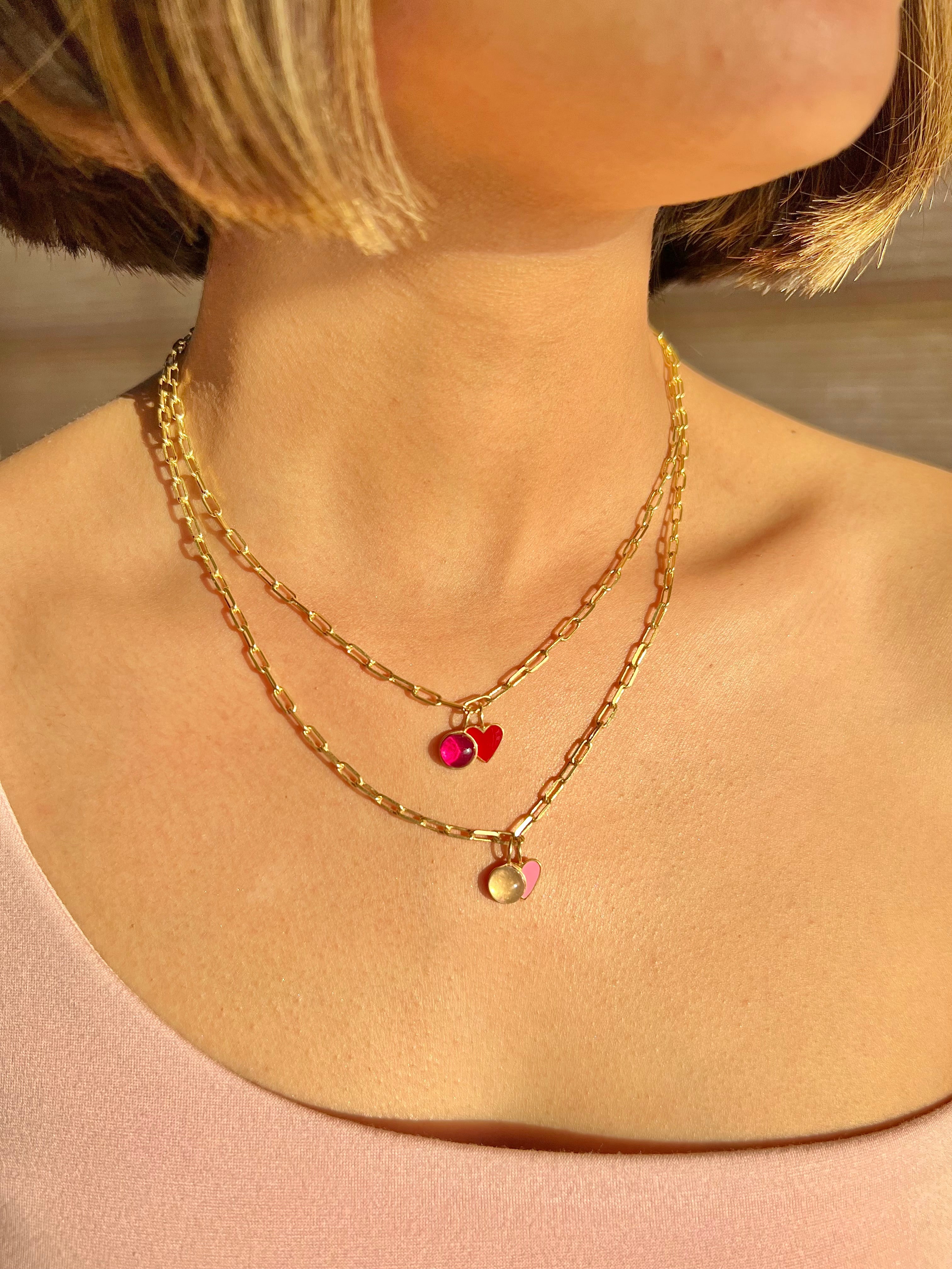Best selling, genuine gemstones and enamel combination strands of love necklace with paper clip chain. Perfect for everyday!