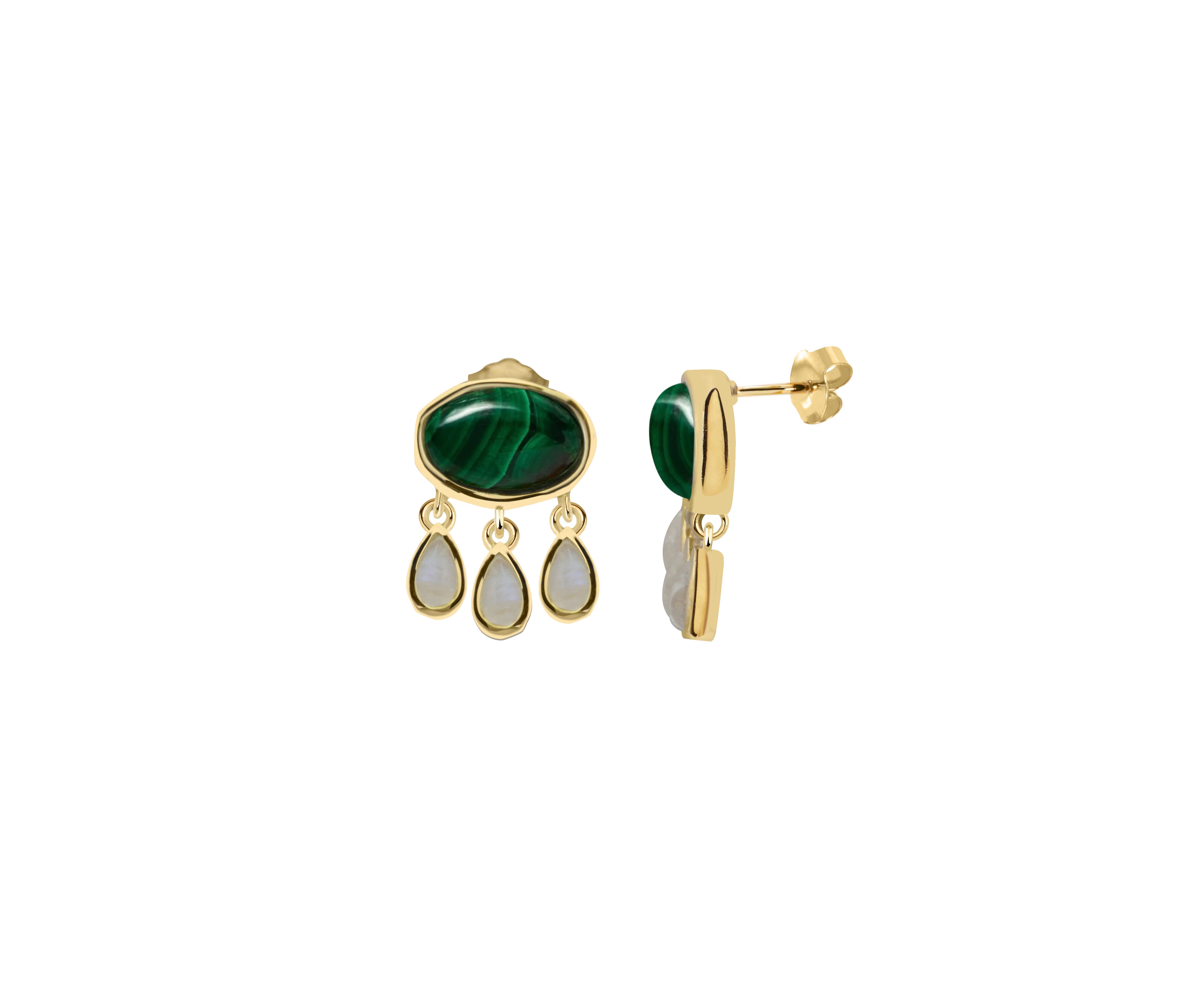 Add a splash of magic to your look with the Malora bubble drop earrings! Featuring vibrant malachite cabochons paired with shimmering moonstone drops, these earrings effortlessly sparkle from sunlit days to moonlit nights. Perfect for those who love a playful twist on elegance, they bring a pop of color and a dash of charm wherever you go.