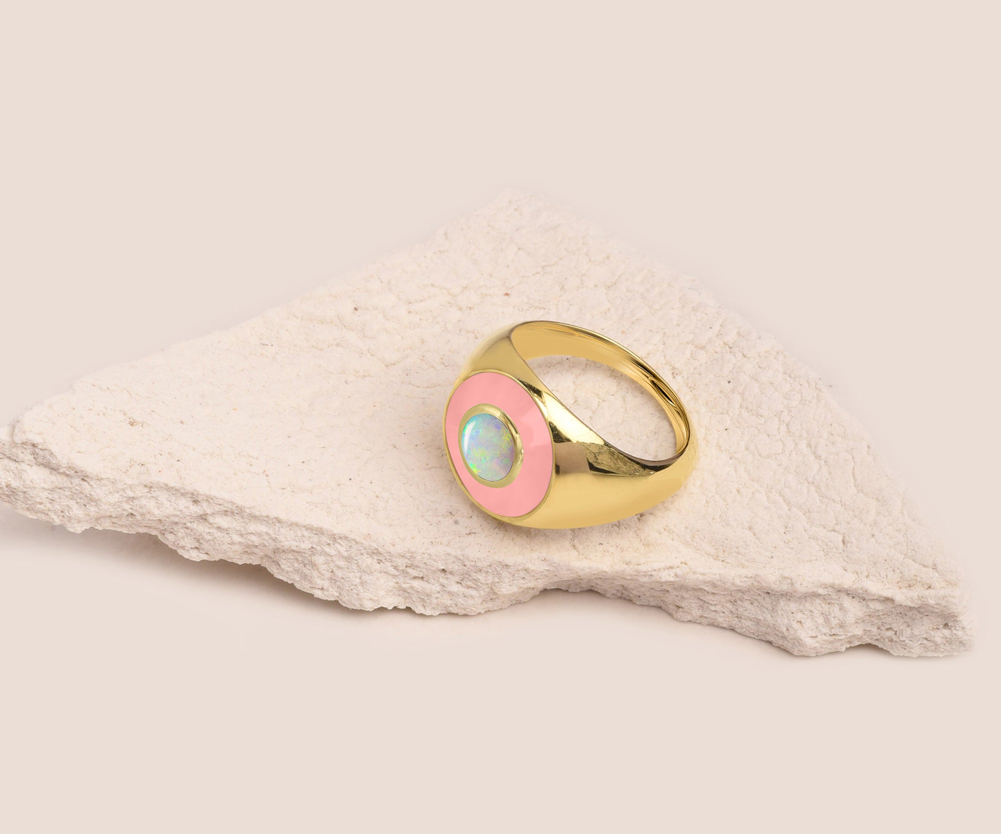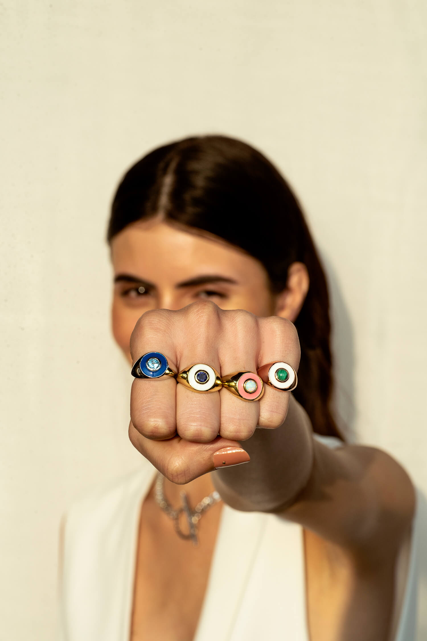 Best selling eyes on me signet ring, featuring one of kind gem and enamel combination. Set in sterling silver.