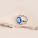 Best selling eyes on me signet ring, featuring one of kind gem and enamel combination. Set in sterling silver.